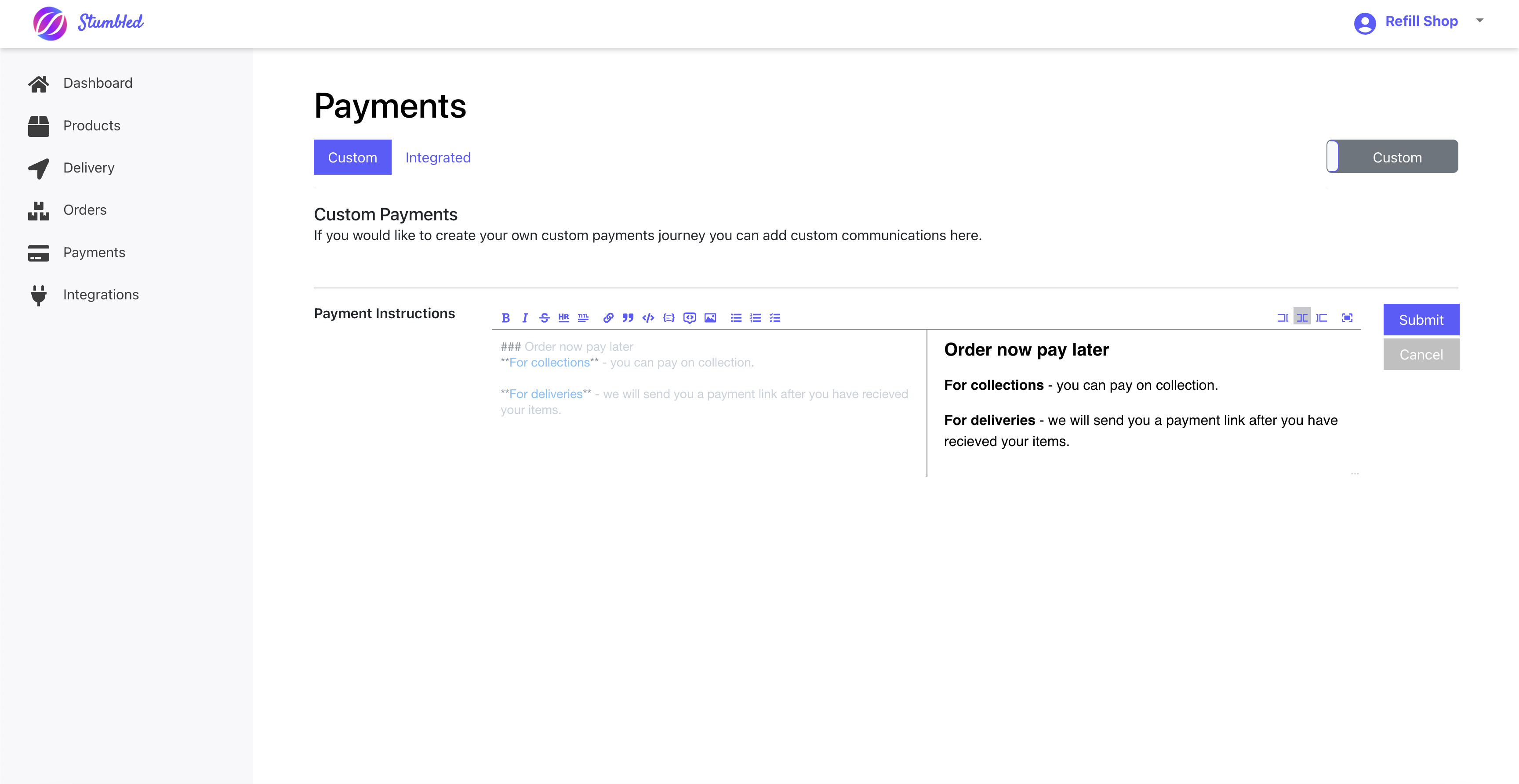 Unlike other e-commerce systems customer payments are captured after the after dispatch. Subsequently, this means you can manage incoming orders, if you don't have the stock, to avoid refunds.